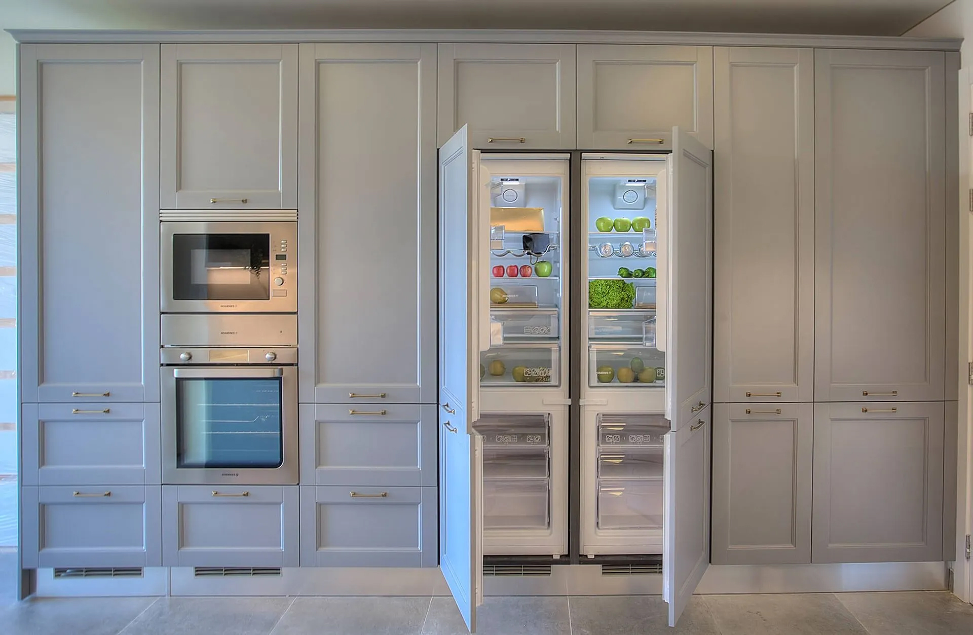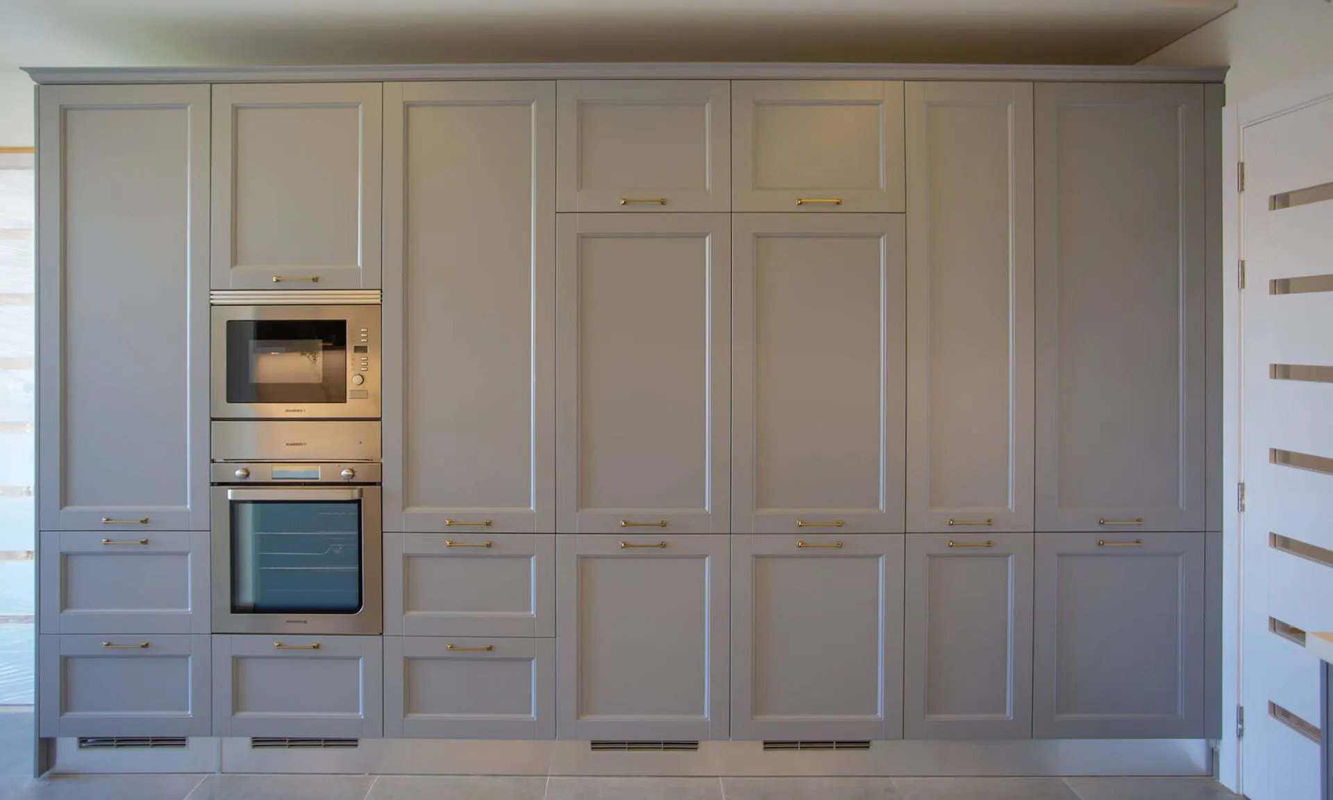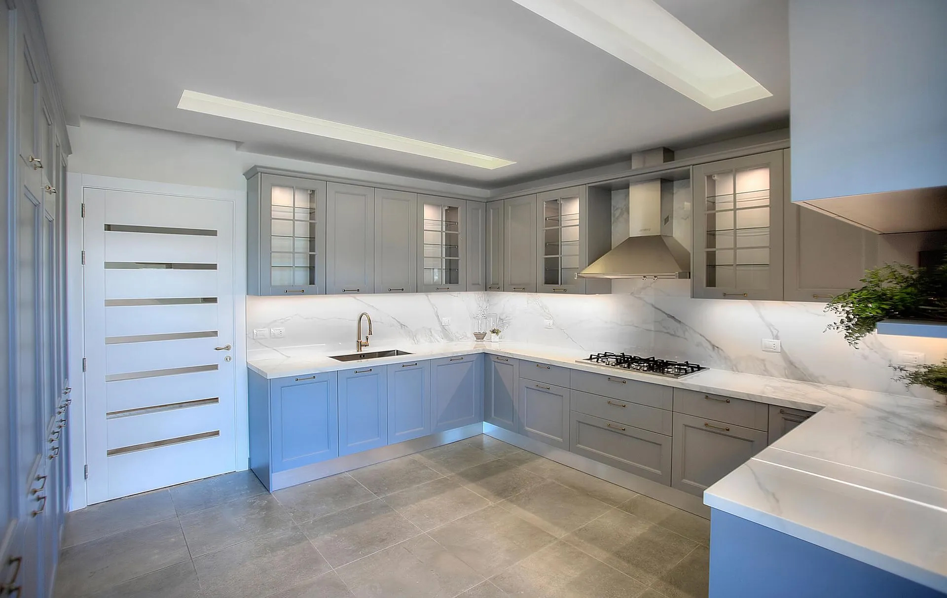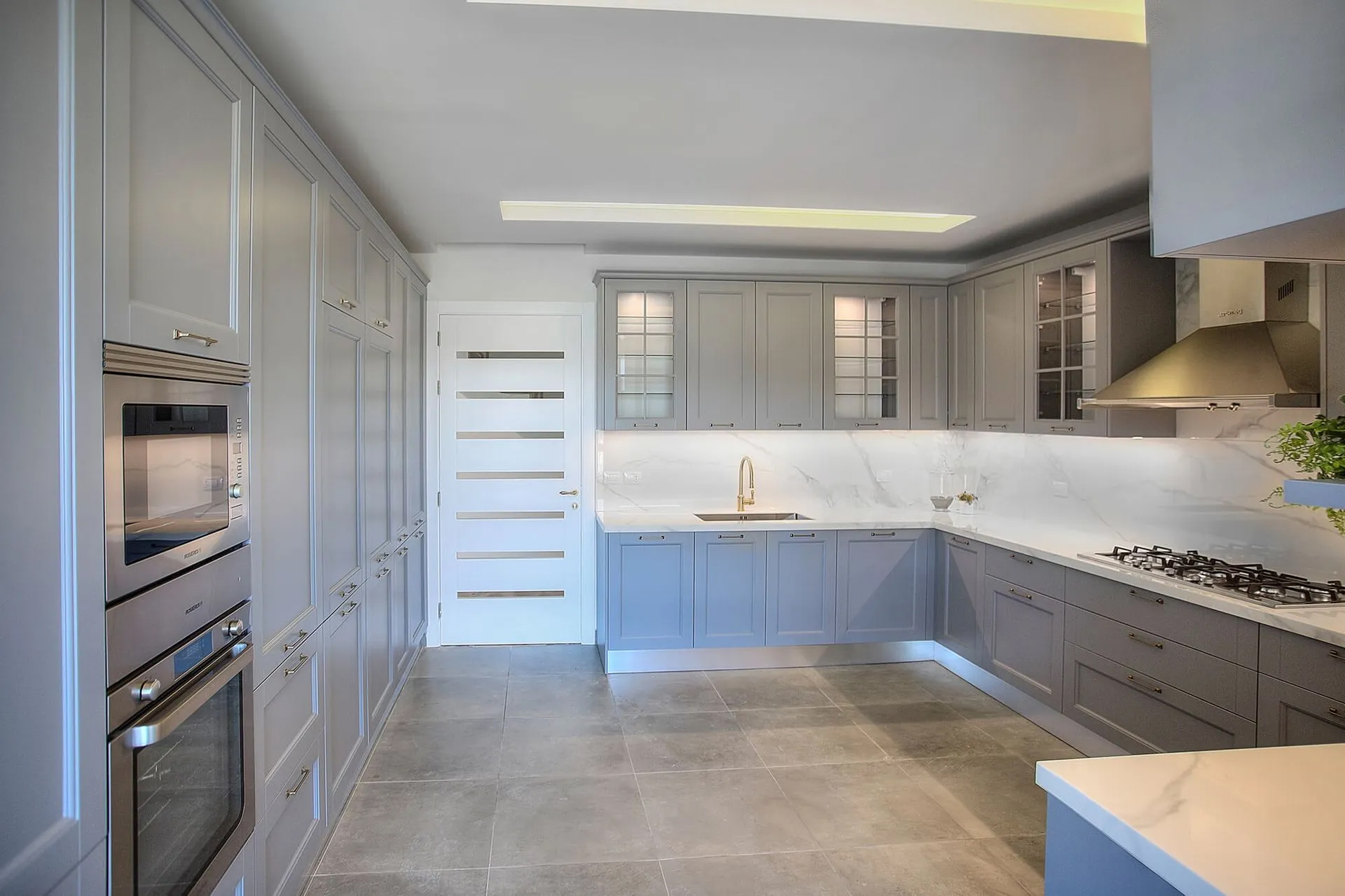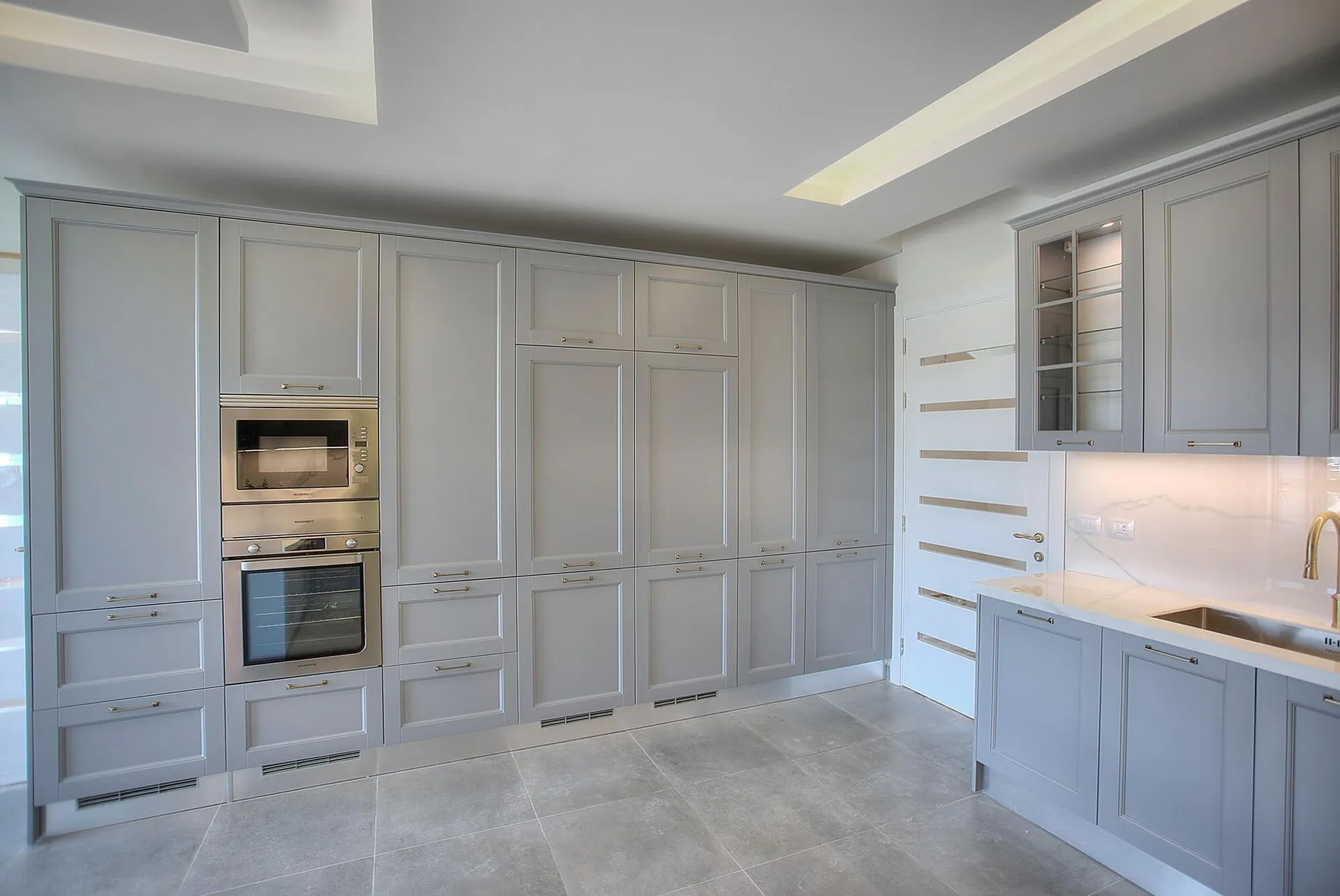 The layout maximizes workflow efficiency, featuring a full-height wall of integrated appliances, concealed refrigeration, and generous storage space. The sleek marble countertops and backsplash, paired with brushed brass fixtures, add a sophisticated touch to the otherwise calm and minimal environment. Hidden lighting details and under-cabinet LEDs provide both ambiance and utility.