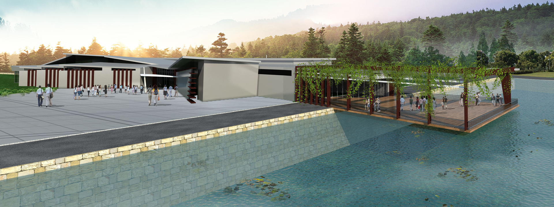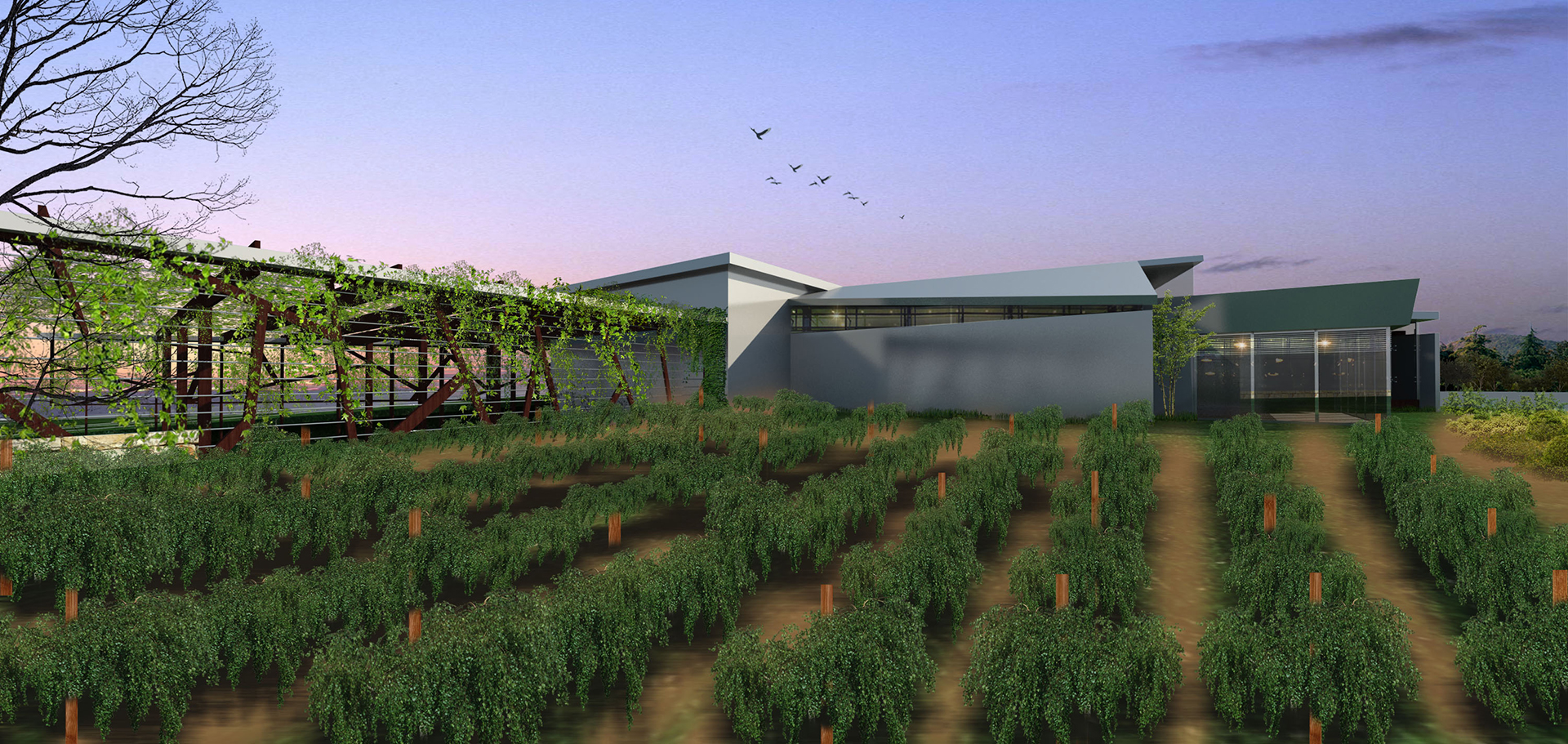 The masterplan includes a wine production facility, tasting rooms, outdoor event platforms, and immersive visitor walkways that flow organically through the vineyards. A dynamic interplay of volumes, reflective water features, pergolas, and open terraces creates a seamless experience between architecture and landscape.
