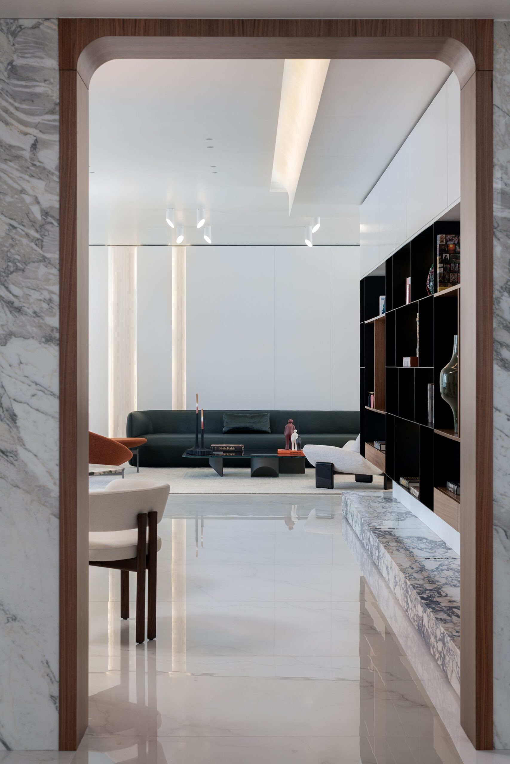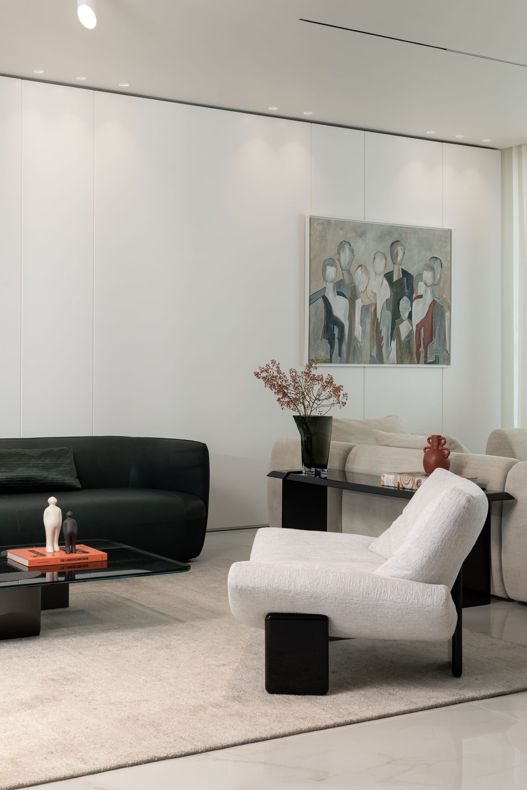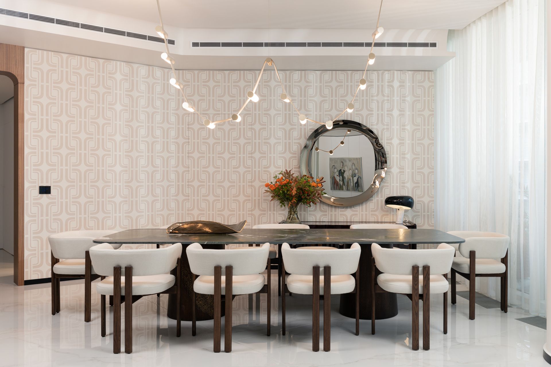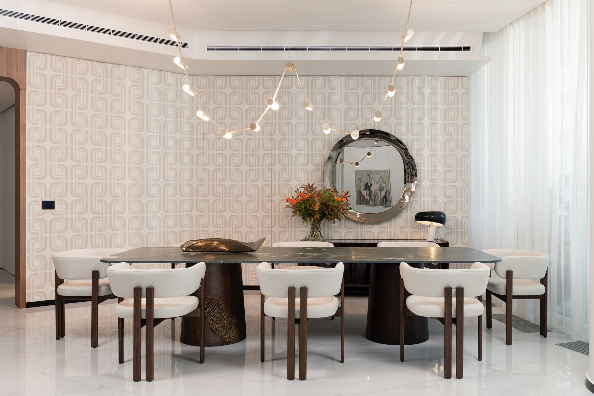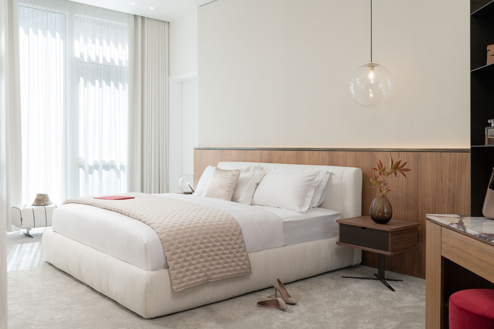 Every detail of this project has been meticulously curated—from high end furniture and rare marble finishes to bespoke lighting installations and seamless spatial flow. The interiors feature warm neutral tones, organic forms, and a mix of natural materials that elevate the ambiance of each room.