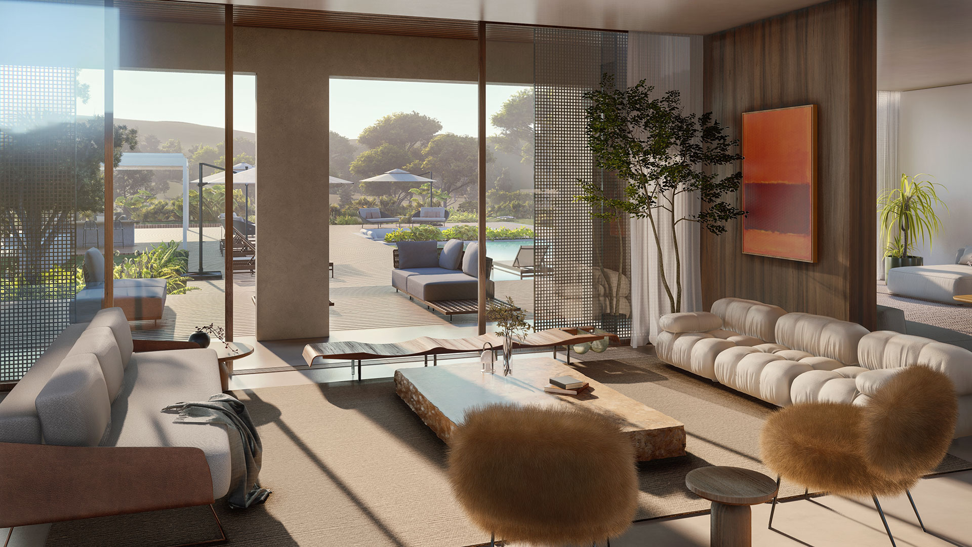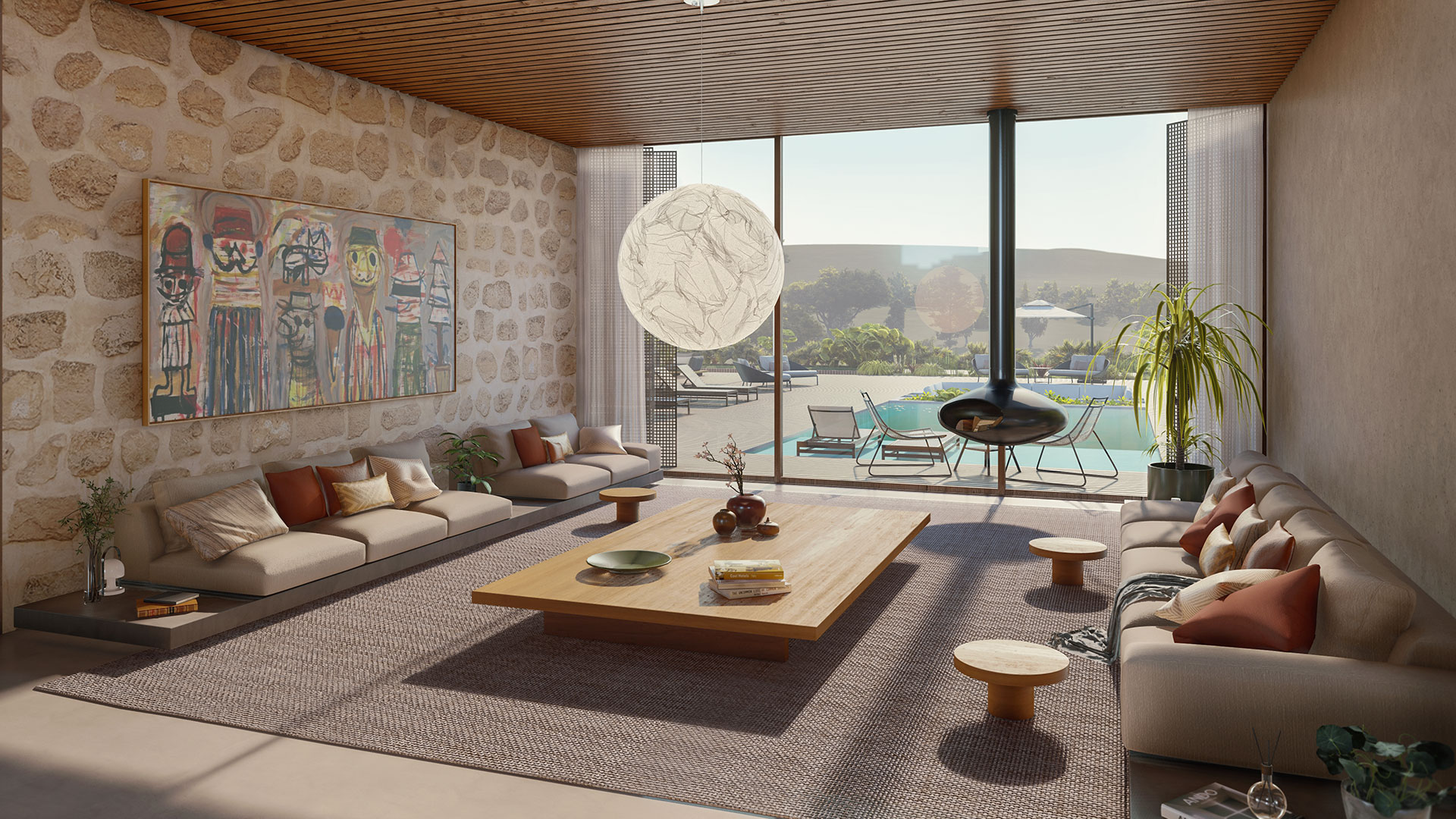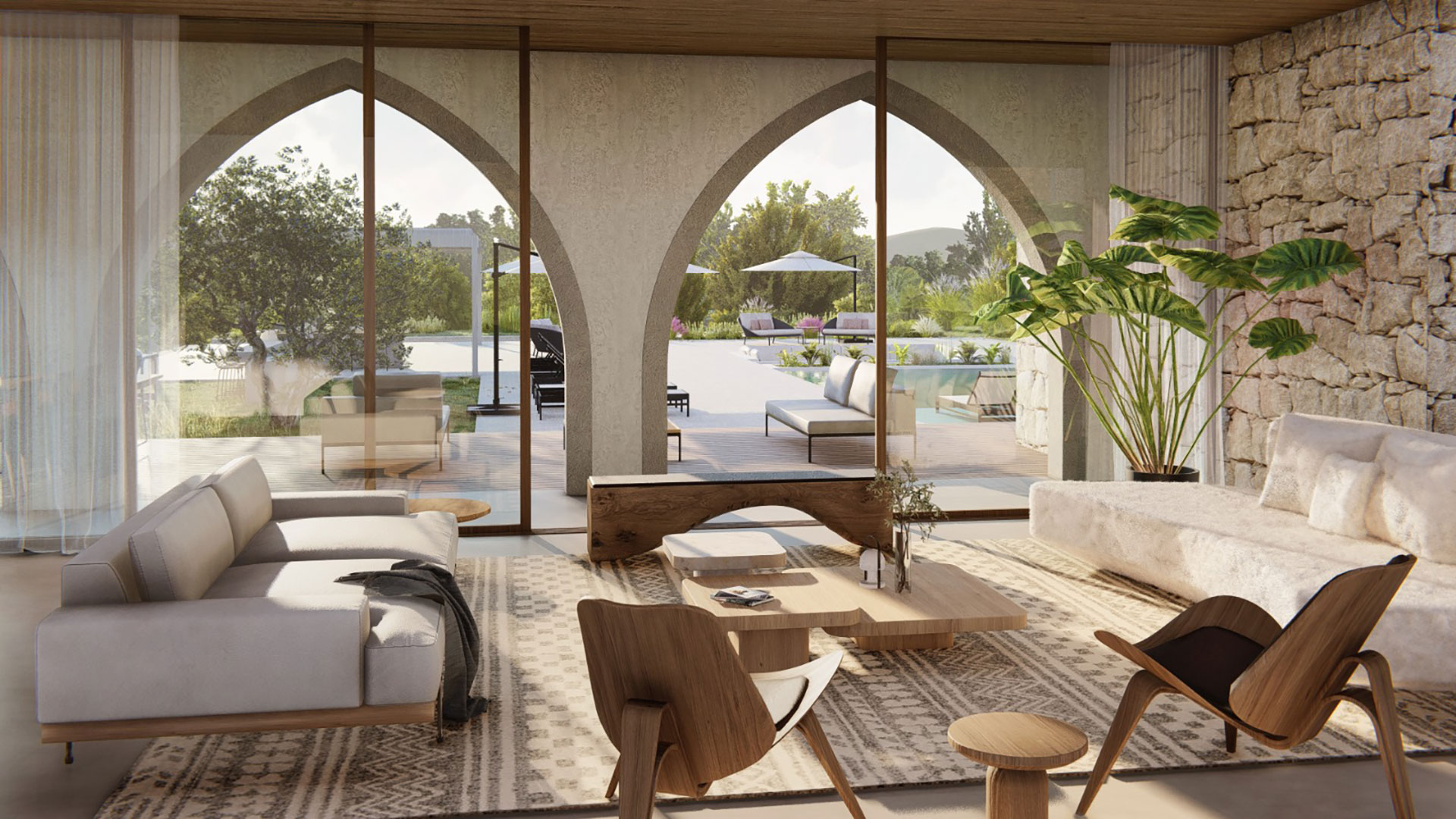 Featuring local stone walls, arched openings, earthy palettes, and bespoke wooden furniture, the interior evokes a grounded elegance rooted in tradition. Floor-to-ceiling glass doors frame breathtaking views while connecting each room seamlessly with the surrounding nature. Low, lounge-style seating and curated handmade details add a sense of warmth, intimacy, and effortless luxury.